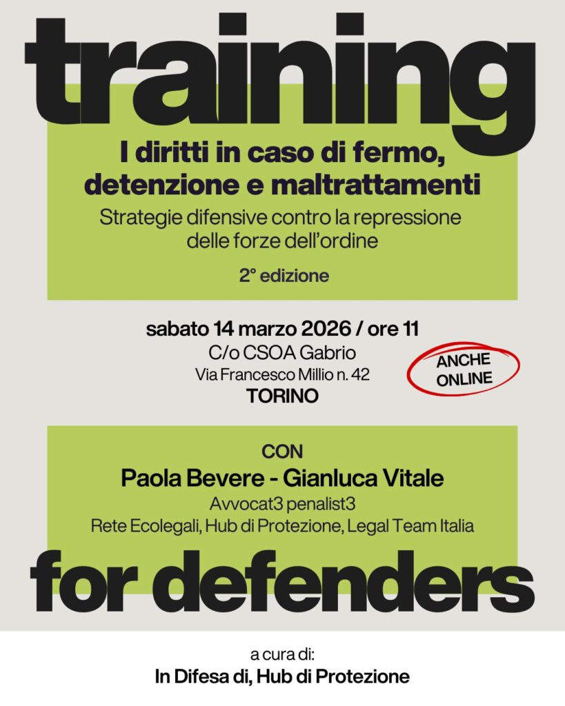 Il training, pensato come percorso di formazione politica, legale e pratica per attiviste e attivisti, organizzazioni, persone del mondo dell’arte, dei sindacati e del giornalismo a rischio criminalizzazione, nasce dalla collaborazione tra la Rete In Difesa di e il Protection Hub, all’interno del progetto P.E.A.C.E. – Protect Eco activism and civil engament, con l’obiettivo di costruire strumenti collettivi di difesa legale, comunicativa, digitale e psicosociale.